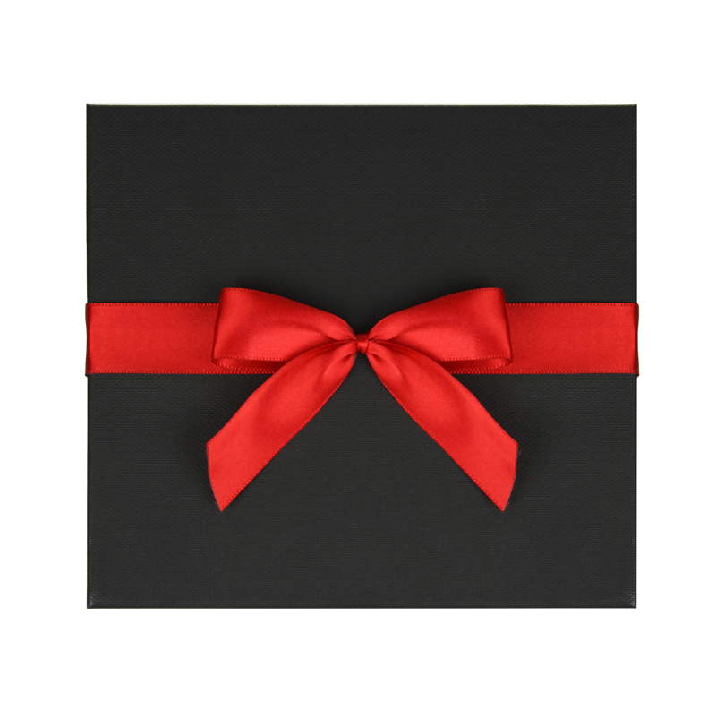 Elegáns díszdoboz piros masnival és fekete papír töltelékkel.